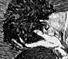 Although Klinger was a painter and a sculptor (his realistic, polychrome statues of nudes approach the ultimate creepiness), what little reputation he has today rests on his engravings, especially the series called A Glove (so titled in its first and third editions, the second edition was entitled Paraphrase on the Finding of a Glove). While individual engravings and another sequence called Fantasy on Brahms are also notable, A Glove is the most prodigal of what de Chirico, in the title of one of his paintings, calls "the joys and enigmas of a strange hour". Although the Glove's scenario was given its due Germanic explication by contemporary critics, it defies rational analysis. The last picture, which was seen as a kind of happy ending to the glove's peregrinations, is particularly ambiguous and leaves the whole meaning of the series in doubt. The story is a parable of loss based on a trivial lost article, like the lost keys in Bluebeard and in Alice, like Desdemona's missing handkerchief, or like the philosopher's spectacles in Klinger's own Fantasy on Brahms, which have slid out of their proprietor's reach just as he was nearing the summit of a kind of Matterhorn. There are overtones of erotic symbolism and fetishism in the glove and the phalloid monster who abducts it, heightened for a modern viewer by the Krafft-Ebing period costumes and décors (the engravings appeared in 1881, and the drawings were apparently finished in 1878).